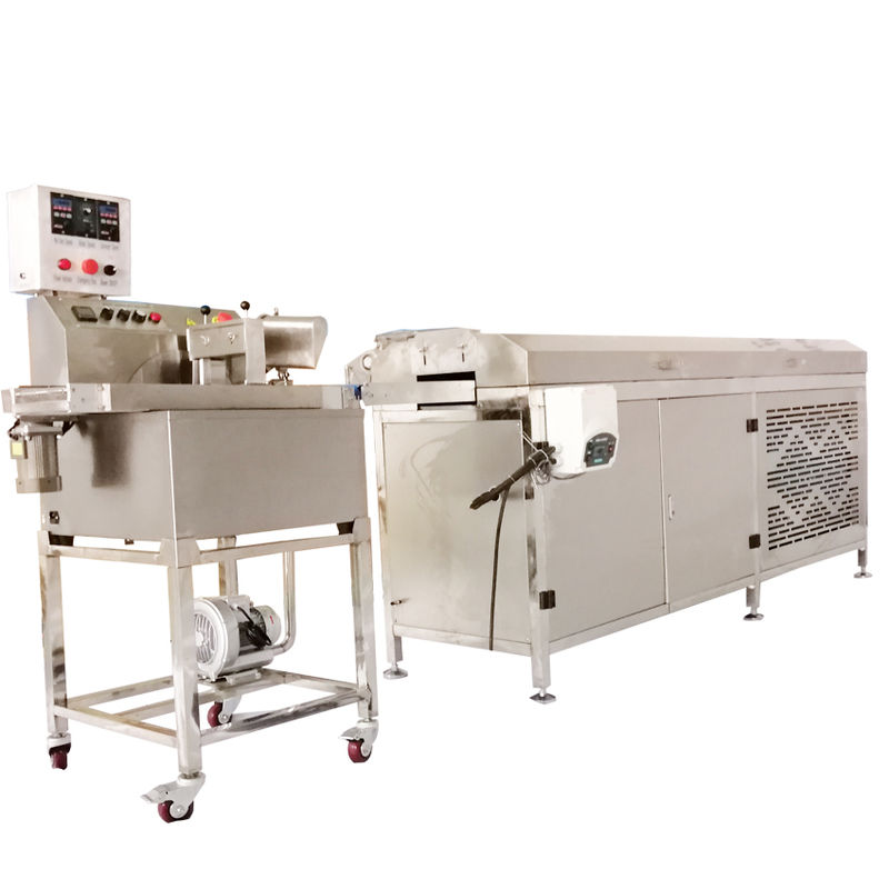 El equipo de enrobing de chocolate es una máquina de enrobing diseñada para caber en la máquina de templado de chocolate cuando se instala en el carrito opcional con ruedas.,Los productos pasan sobre una cinta de malla de alambre de 180 mm de ancho y están cubiertos por un sistema de cascada de doble cortina.La máquina de enrolar el chocolate cubre la parte superior y inferior o sólo la parte superiorPara la parte inferior sólo, se dispone de un botoner bajo petición especial.